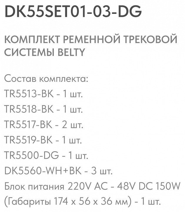 Компоненты, входящие в комплектоснование TR5513-BK - 1 шт.. крепеж крепеж TR5518-BK - 1 шт.. крепеж TR5517-BK - 2 шт.. крепеж TR5519-BK - 1 шт.. шинопровод TR5500-DG - 1 шт.. светильник на шине DK5560-BK - 3 шт.. блок питания 220V AC - 48V DC 150W (Габариты 174 x 56 x 36 мм)