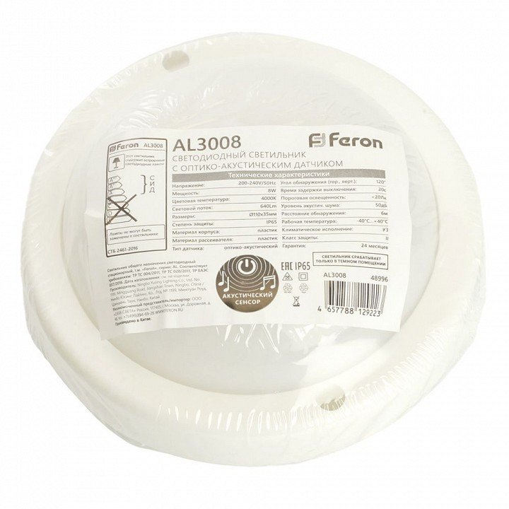 Станьте первым, кто оставит отзыв о товаре Светильник светодиодный пылевлагозащищённый с оптико- акустическим датчиком Feron AL3008 в пластиковом корпусе 8W 4000K 220V IP65 белый 48996