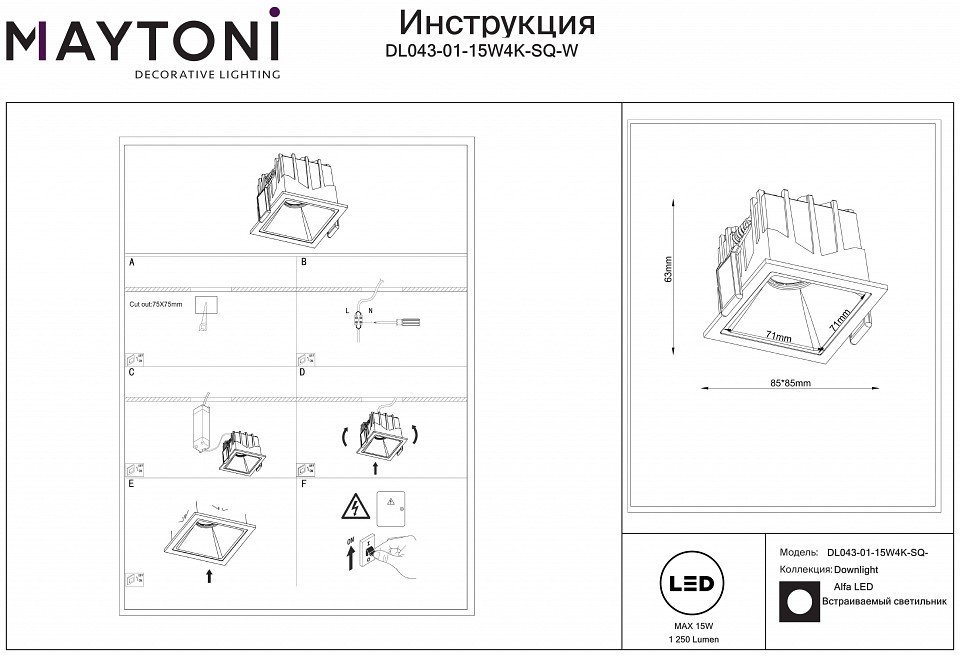 Станьте первым, кто оставит отзыв о товаре Точечный светильник Maytoni Alfa LED DL043-01-15W4K-SQ-W