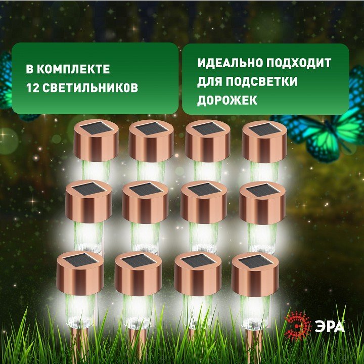 Компоненты, входящие в комплектсветильники - 12 шт.. аккумулятор 1.2 V Li-Ion (время работы без подзарядки 8 часов). солнечная батарея