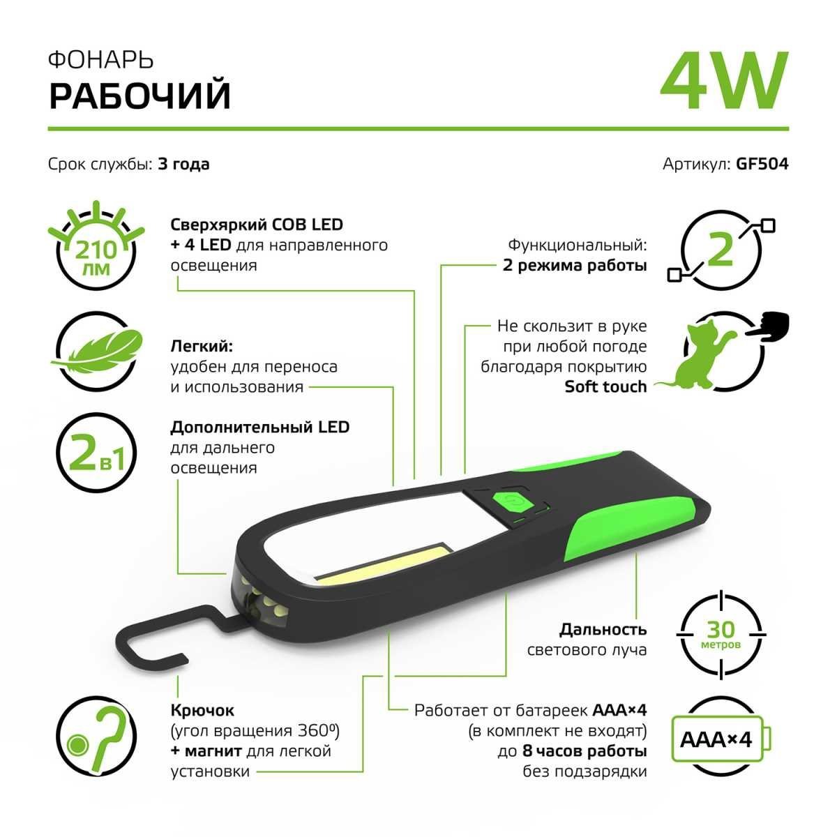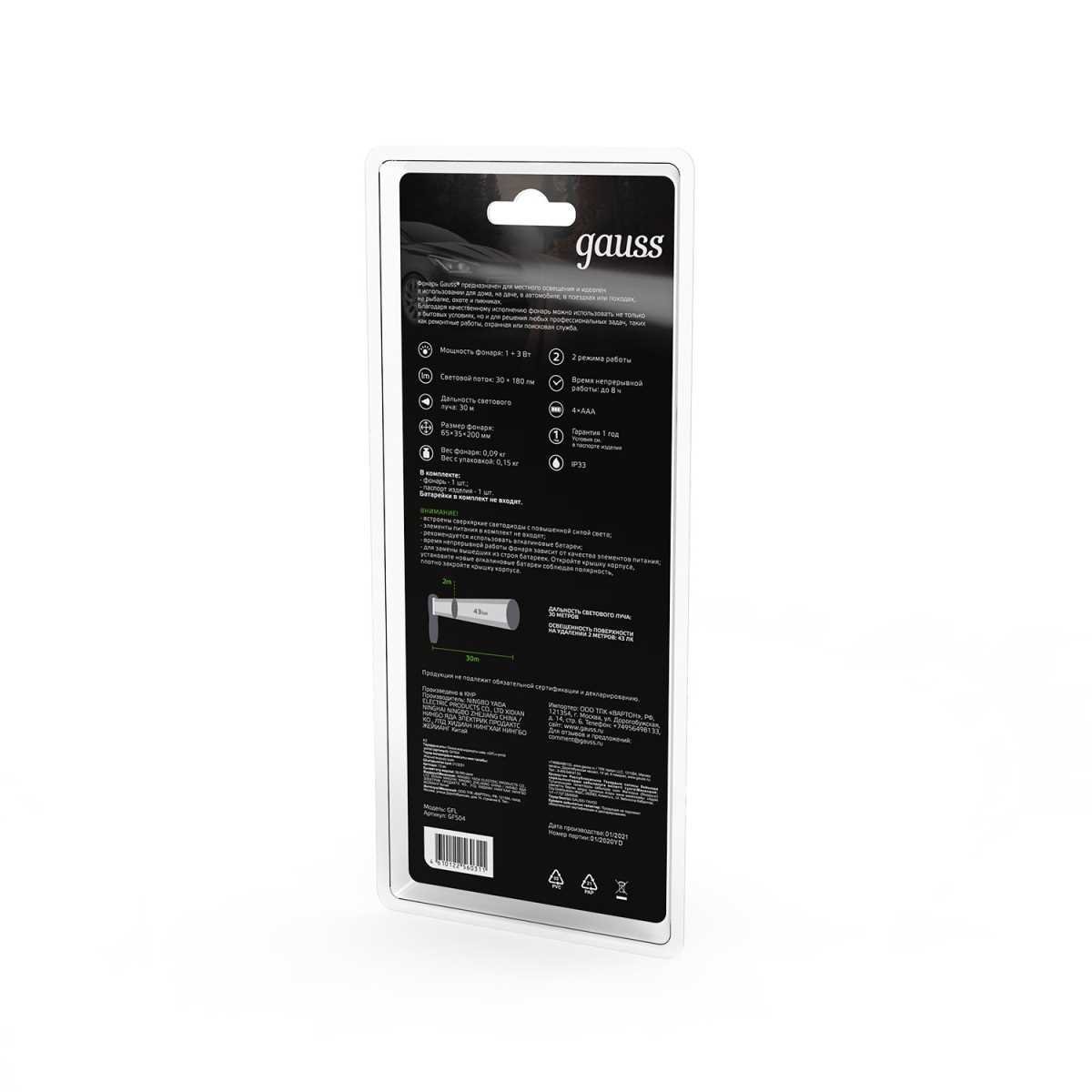 Станьте первым, кто оставит отзыв о товаре Рабочий светодиодный фонарь Gauss от батареек 200х65 210 лм GF504