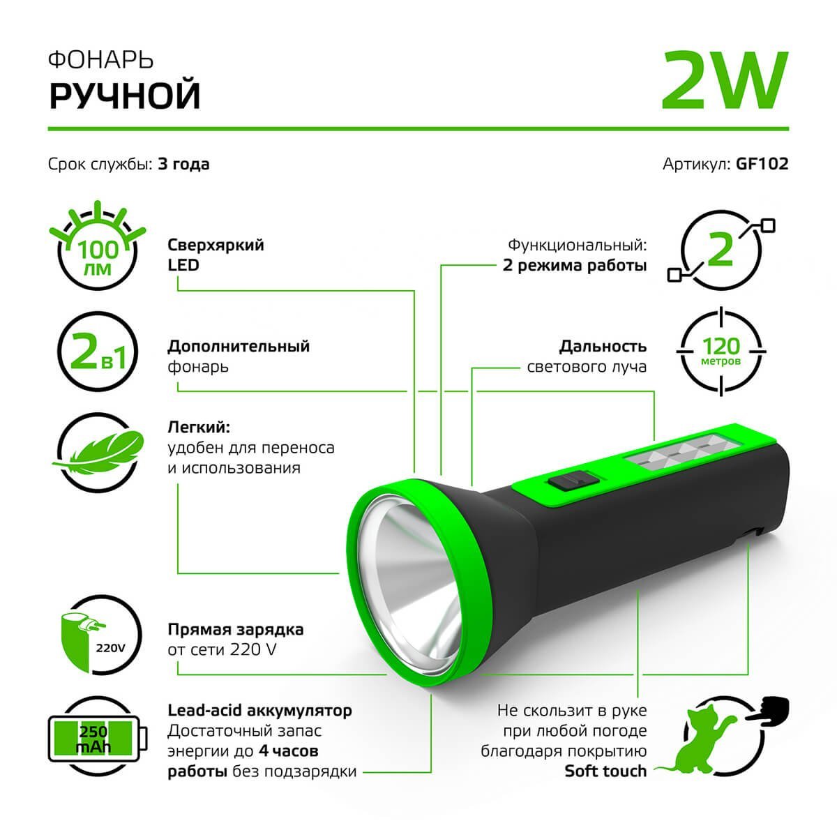 Станьте первым, кто оставит отзыв о товаре Ручной светодиодный фонарь Gauss аккумуляторный 157х58 100 лм GF102